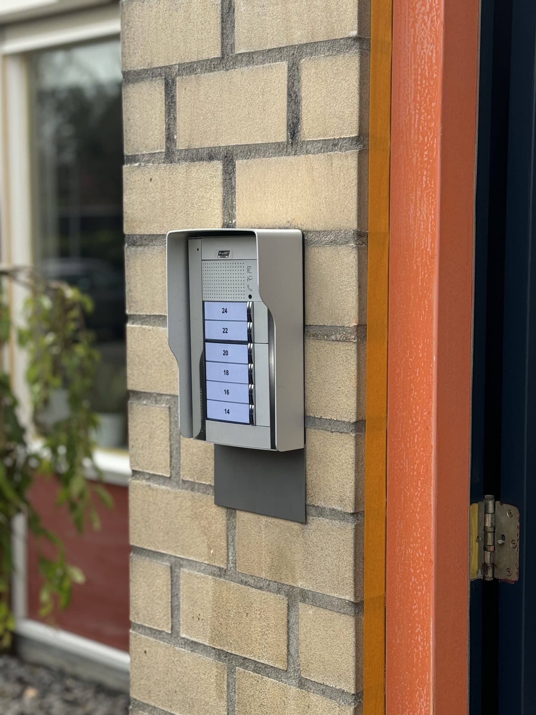 Bij de entree is een stijlvol en robuust buitentoestel geplaatst met duidelijke drukknoppen en naamplaathouders. Vanuit de appartementen kunnen bewoners via hun binnenpost direct horen wie er aanbelt en met één handeling de deur openen. De installatie is helder in geluid, betrouwbaar in gebruik en volledig onderhoudsvriendelijk.